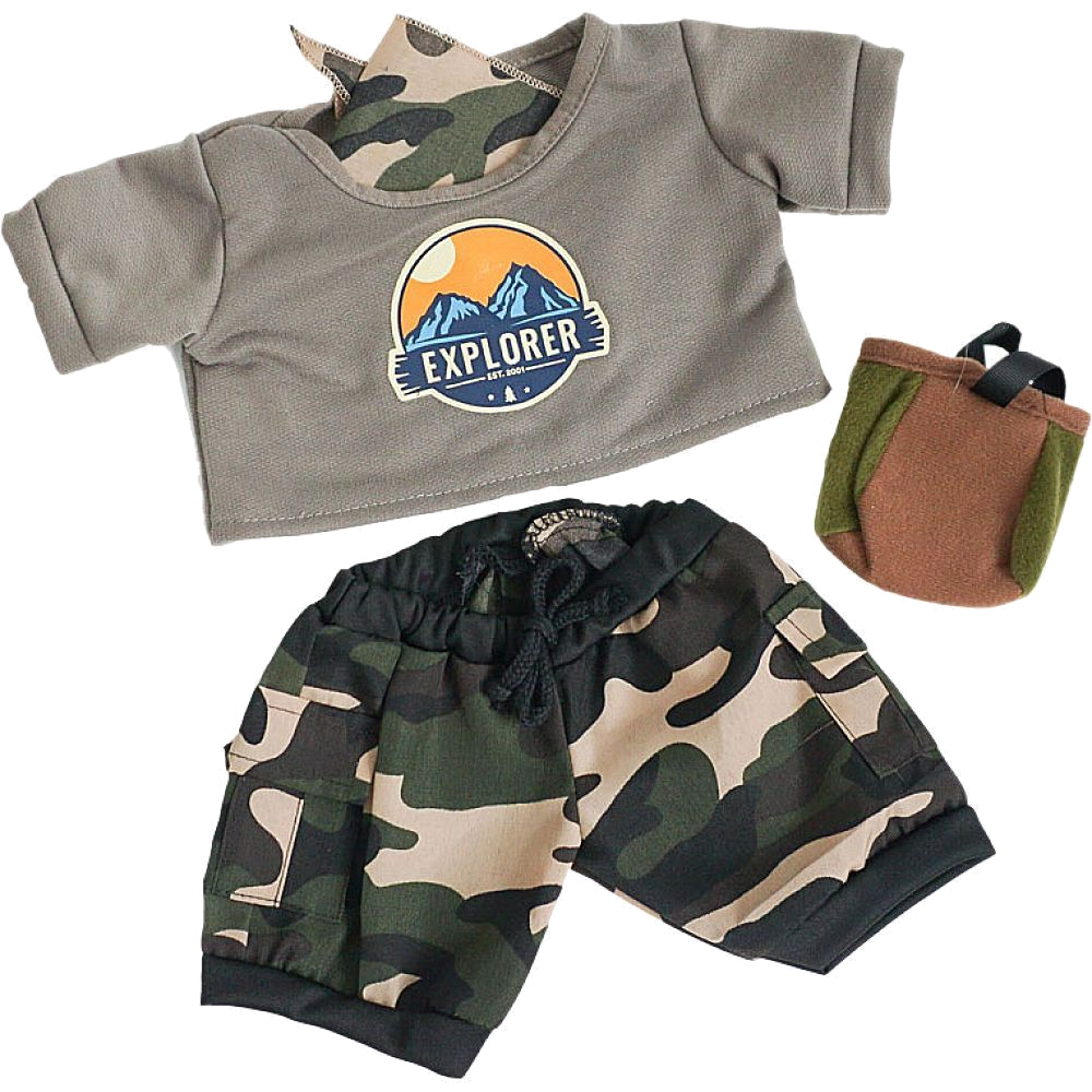 Deze set bestaat uit een T-shirt met explorer print, camouflage broek, sjaaltje en tasje.