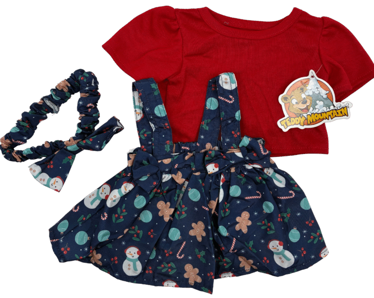 Deze set bestaat uit een blauw kerstkleedje, een rode T-shirt en een haarband.