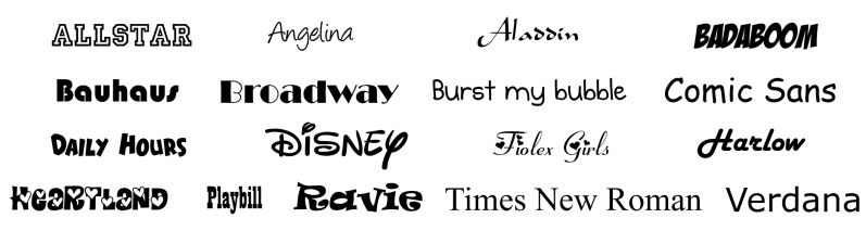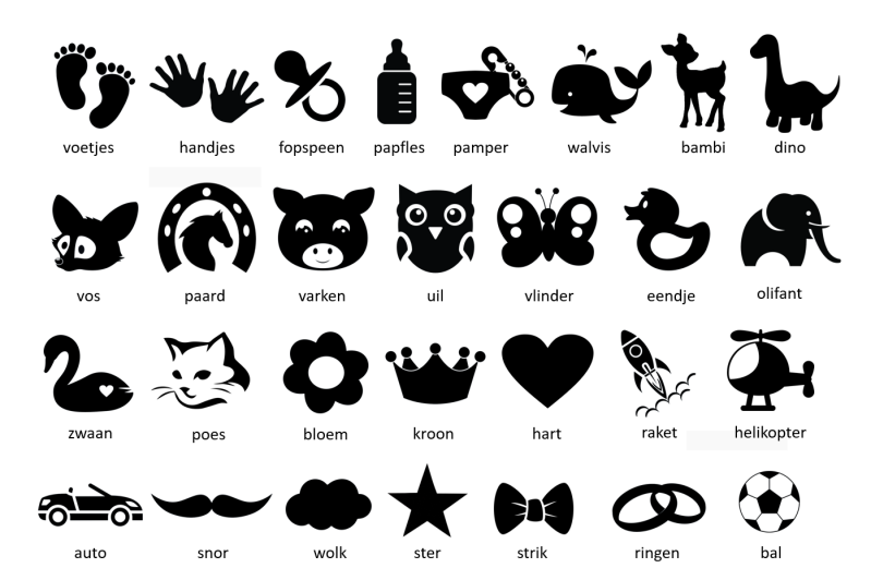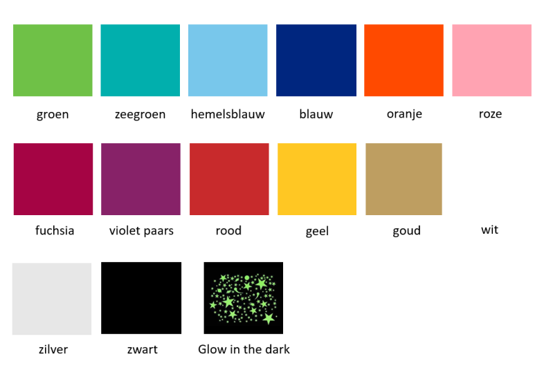 Een overzicht van de verschillende lettertypes, figuurtjes en kleuren opdruk kan je onderaan deze pagina terugvinden.
